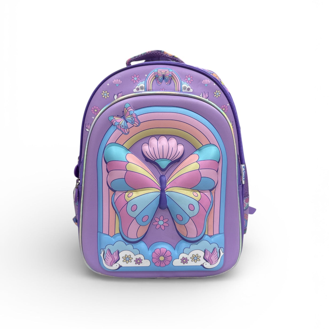 Brighten up school days with this cheerful Butterfly Rainbow Backpack! Featuring a vibrant butterfly with rainbow arches, flowers, clouds, and birds, this bag is perfect for kids who love playful and colorful designs. ✨ Spacious main compartment for books, toys, or travel essentials. ✨ Durable material with whimsical nature‑themed accents. ✨ Comfortable straps for everyday use. Let your child carry joy and creativity wherever they go — school, outings, or playtime!