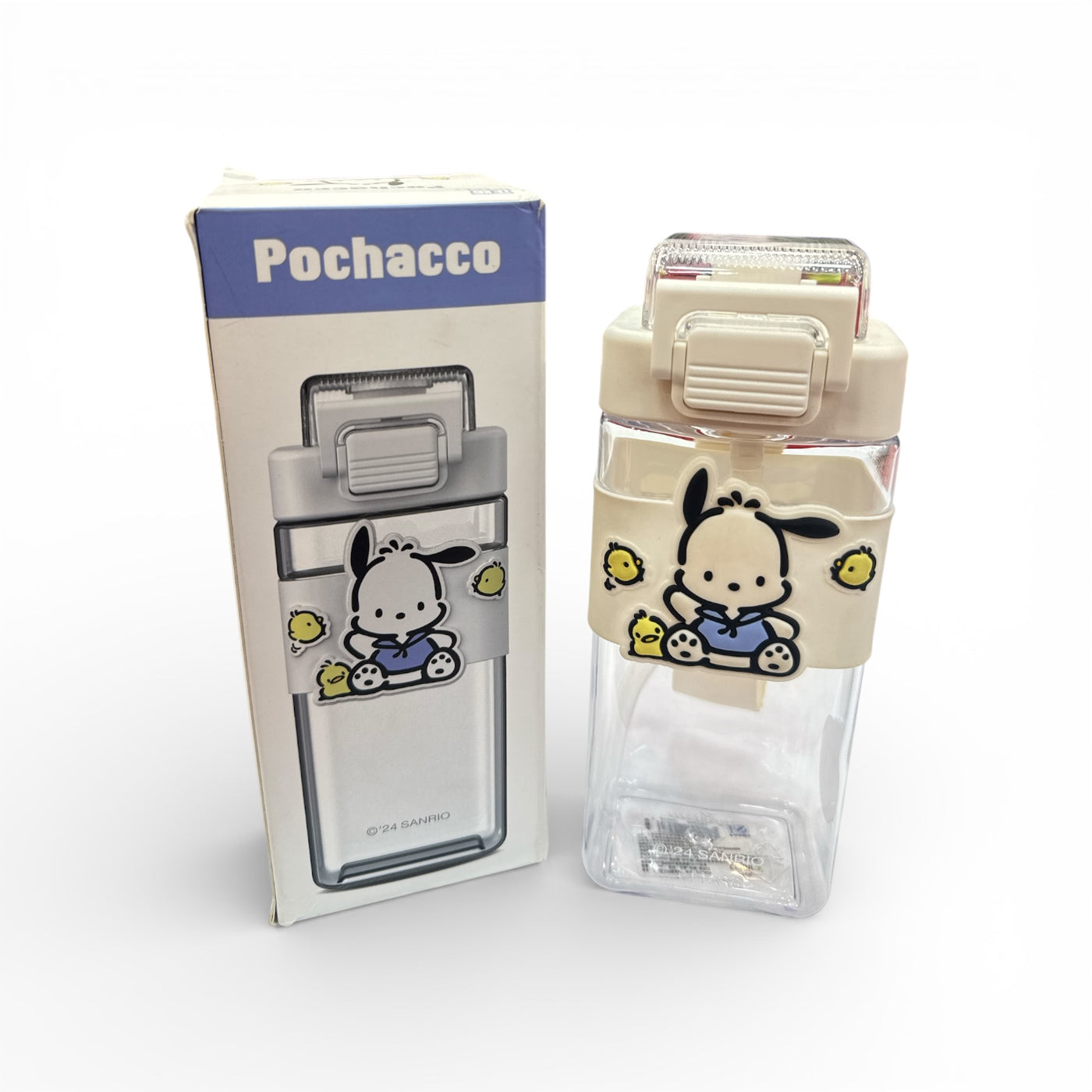 Bring cuteness to your hydration routine with the Sanrio Pochacco Flip-Top Water Bottle. Featuring the lovable white pup Pochacco with his yellow chick friends, this rectangular bottle comes with a secure flip-top lid and latch for spill-free use. The decorative band adds charm, while the durable design makes it perfect for school, travel, or everyday adventures.
